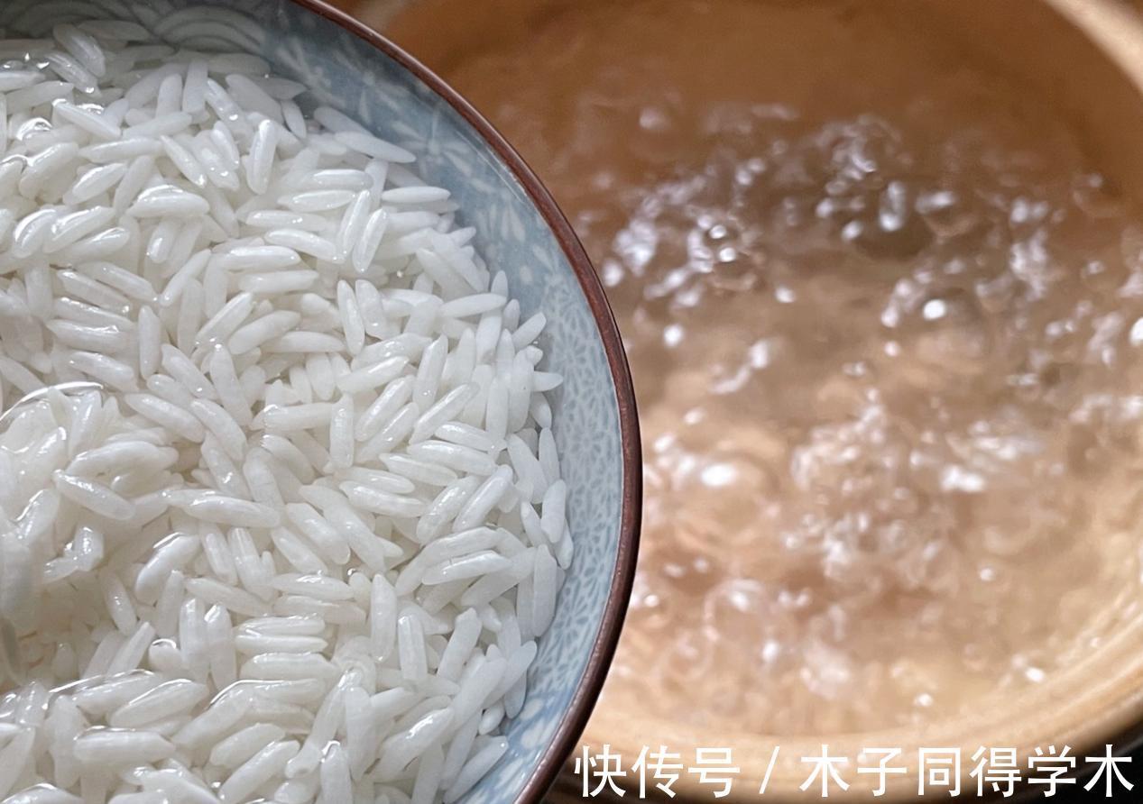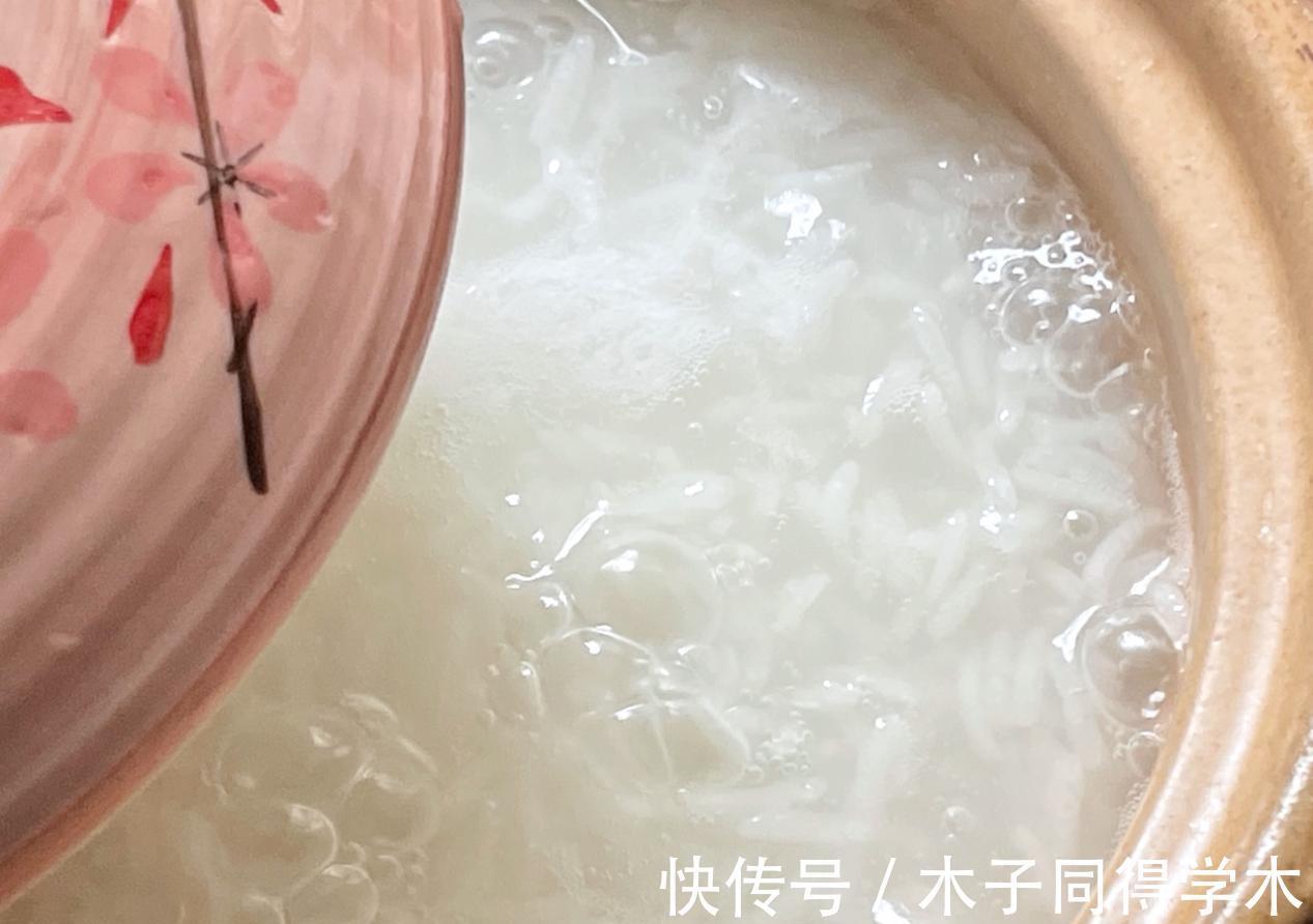 3、大米要提前浸泡一晚上,这样煮出来的粥更软烂好消化。煮的时候要不停搅拌,防止粘锅。