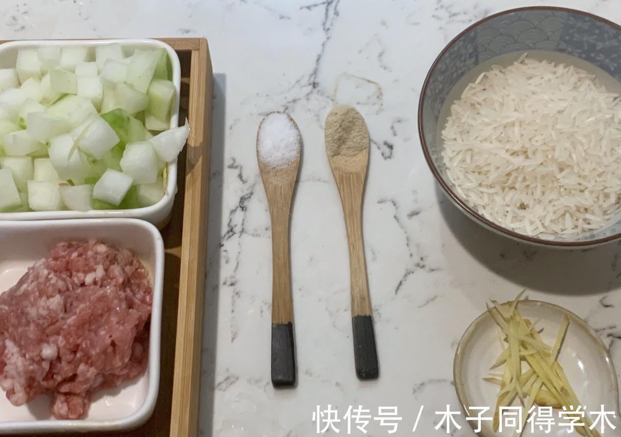 [所需菜品]:肉末、冬瓜、大米、姜丝、白胡椒粉、盐、清水。