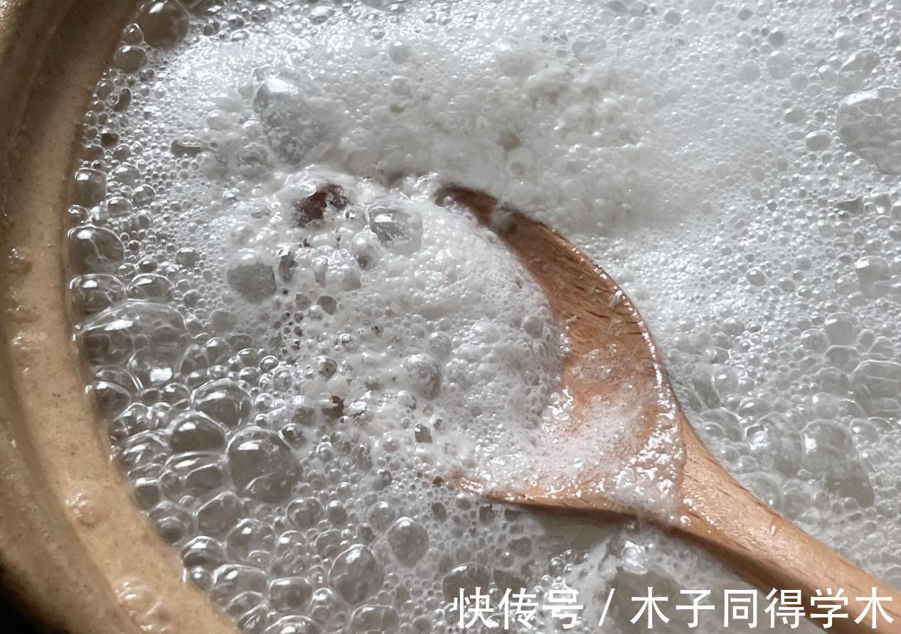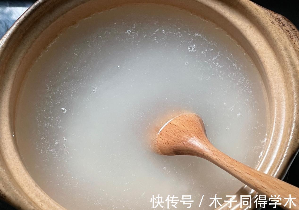 3、大米要提前浸泡一晚上,这样煮出来的粥更软烂好消化。煮的时候要不停搅拌,防止粘锅。